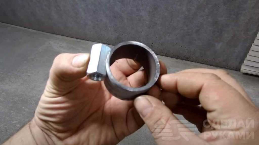 Отрезаем кусок круглой трубы, делаем в нем две прорези (продольную и поперечную), после чего привариваем удлиненную гайку.