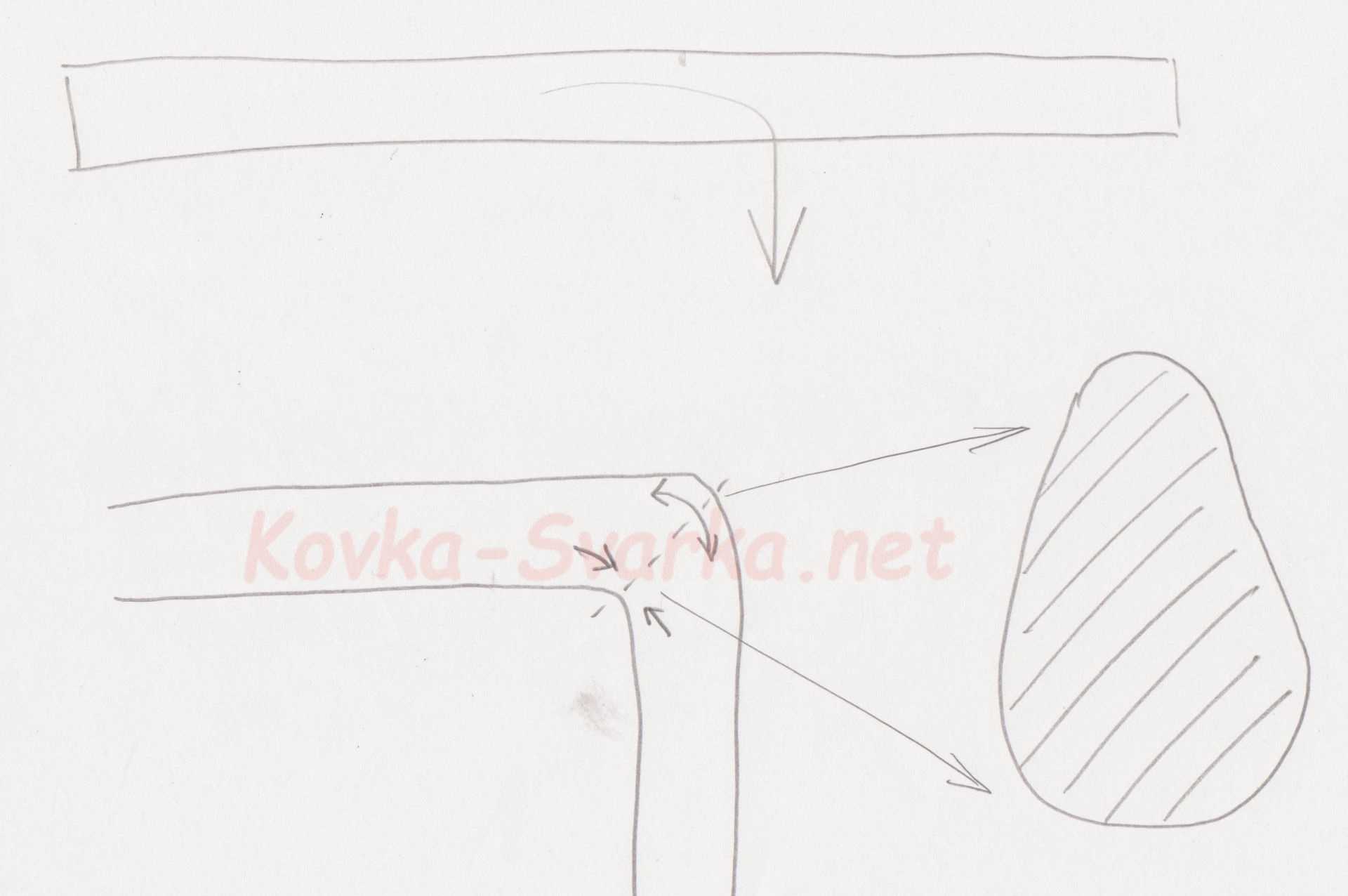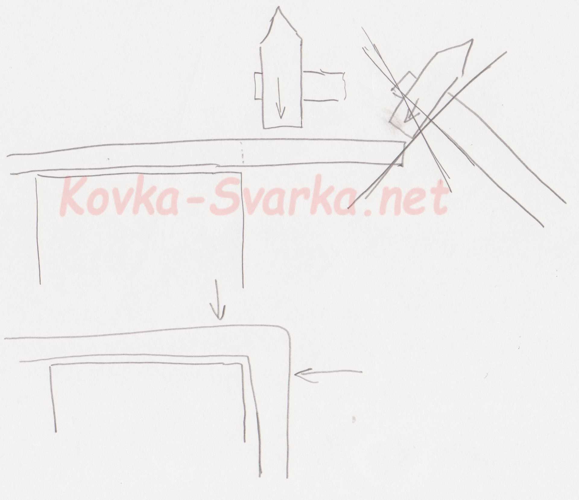 Гибка под прямым углом делается на наковальне. Для этого нужно заготовку положить на лицо так, чтобы на ребро наковальни легла вершина угла заготовки. Потом ее нужно прижать. При помощи ручника выполняют сгибание выступающего конца заготовки вниз. Удары нужно осуществлять ближе к ребру наковальни, а не к концу заготовки. Удобнее всего гибку делать в разогретом состоянии.