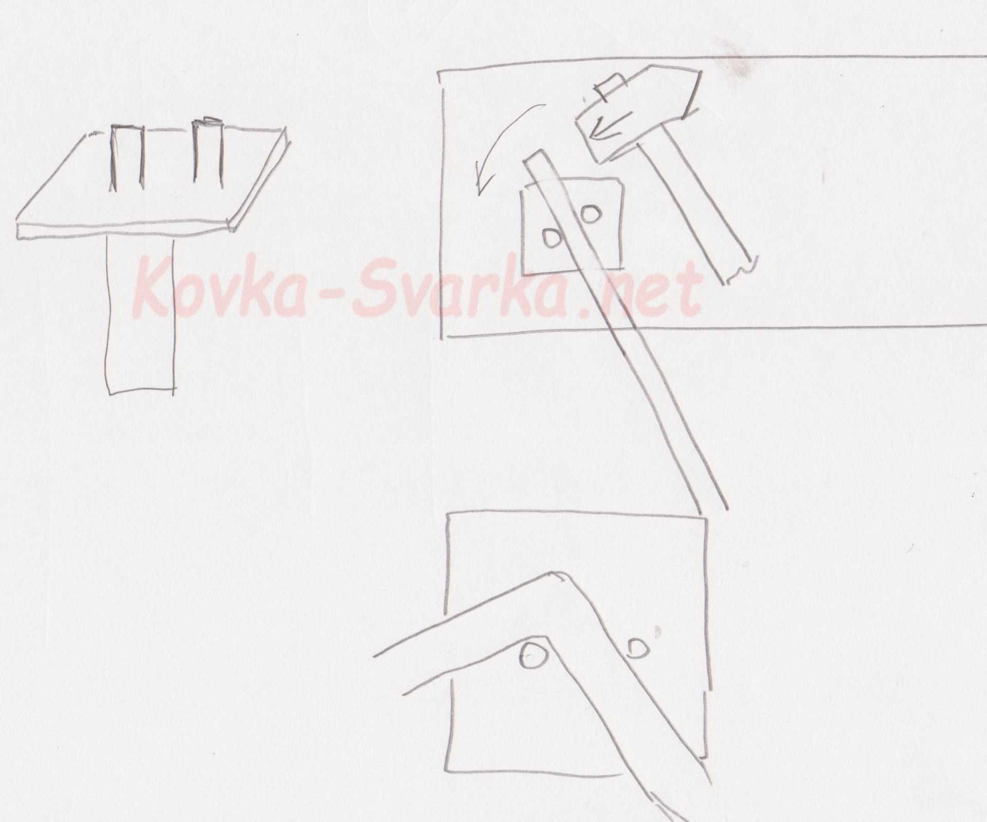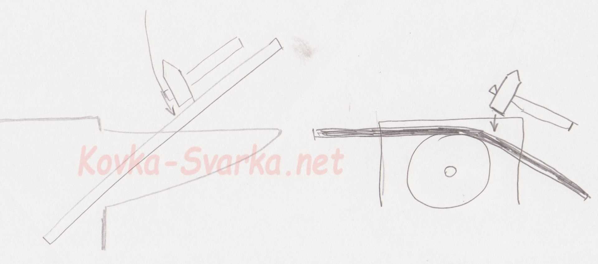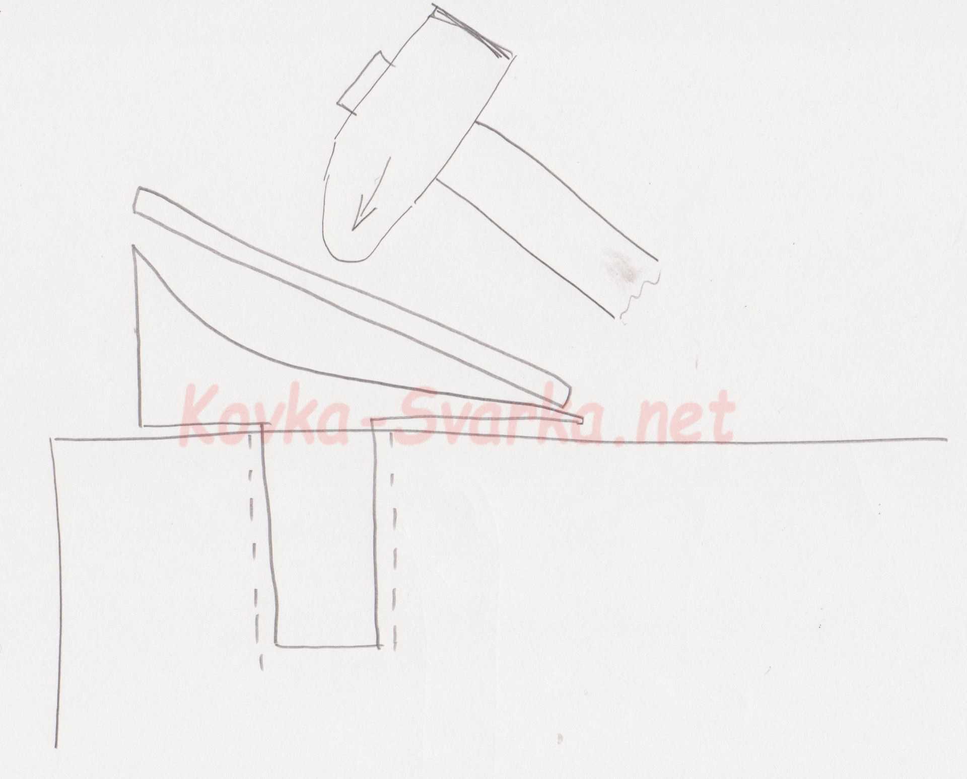 Для тонких металлических полос и листового металла используют подкладные инструменты, которые формируют угол и характер гибки. Металлическую полоску необходимо положить на нижник и несколькими точными ударами нужного конца молотка отковать.
