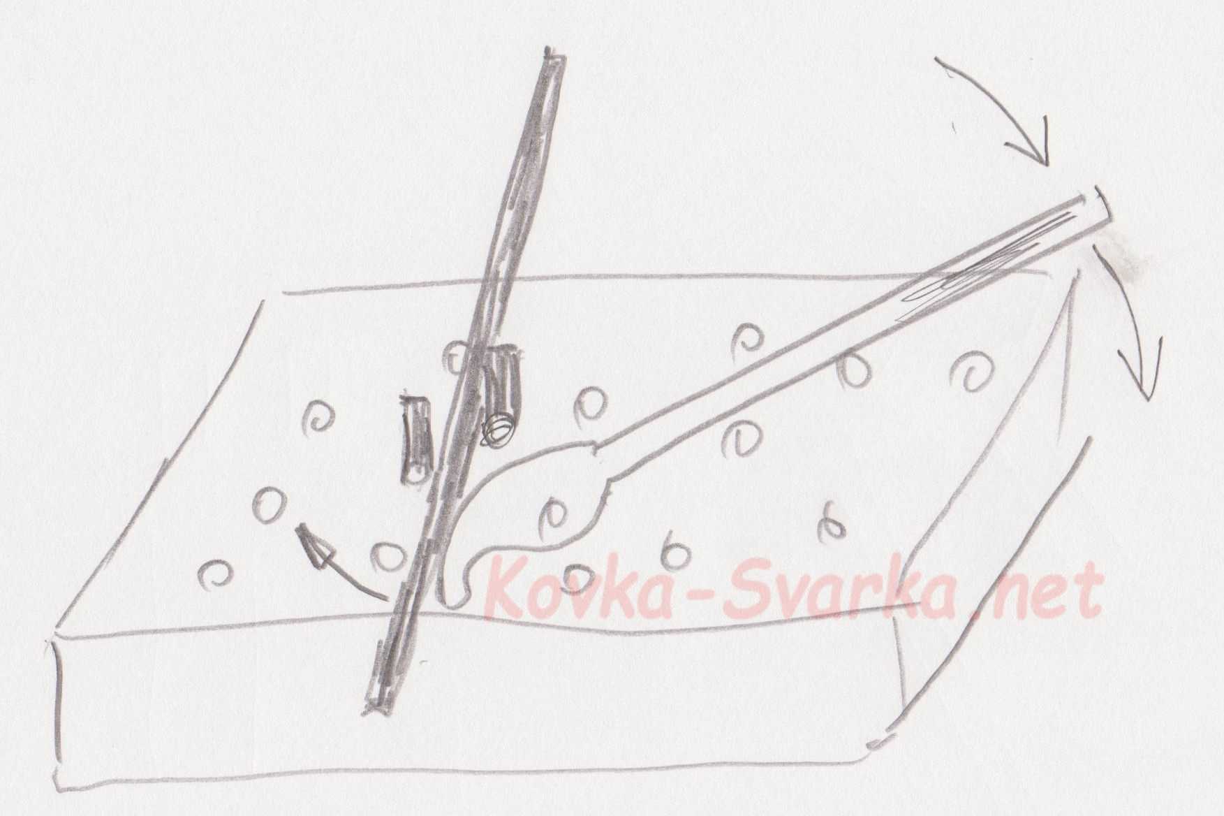 Также часто гибка в вилке-нижнике делается ручной вилкой. Заметьте разницу — если гнуть заготовку без ручной вилки, то она гнется по всей длине, а если использовать вилку (мартышку), то гибка уже идет более точная, локальная.