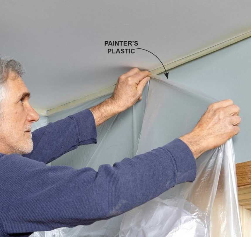 Если вы красите потолок с помощью распылителя, стены лучше всего закрыть полиэтиленовой плёнкой. И вот простой способ, как сделать это легко и быстро. Используйте малярный скотч с уровнем клейкости от среднего до высокого. Приклейте его вдоль стены, но так, чтобы нижний край скотча оставался свободным. К этому краю приклейте лёгкую полиэтиленовую плёнку, чтобы её свободный край доходил до самого пола. Не нужно засовывать плёнку под скотч – просто сначала отогните свободный край скотча наверх, а затем разогните его обратно, когда приложите плёнку.