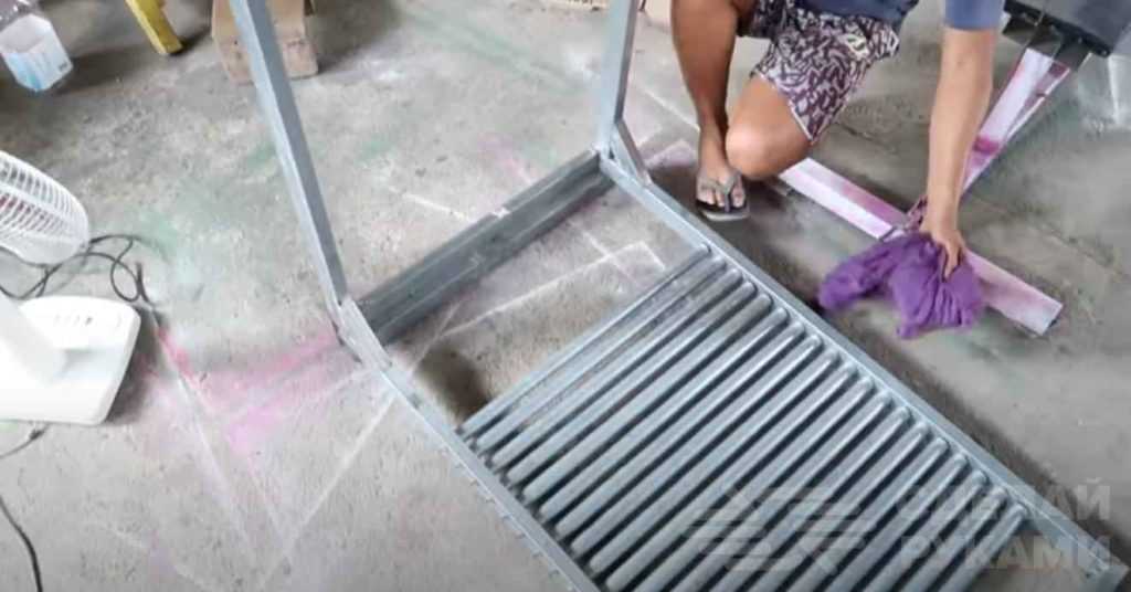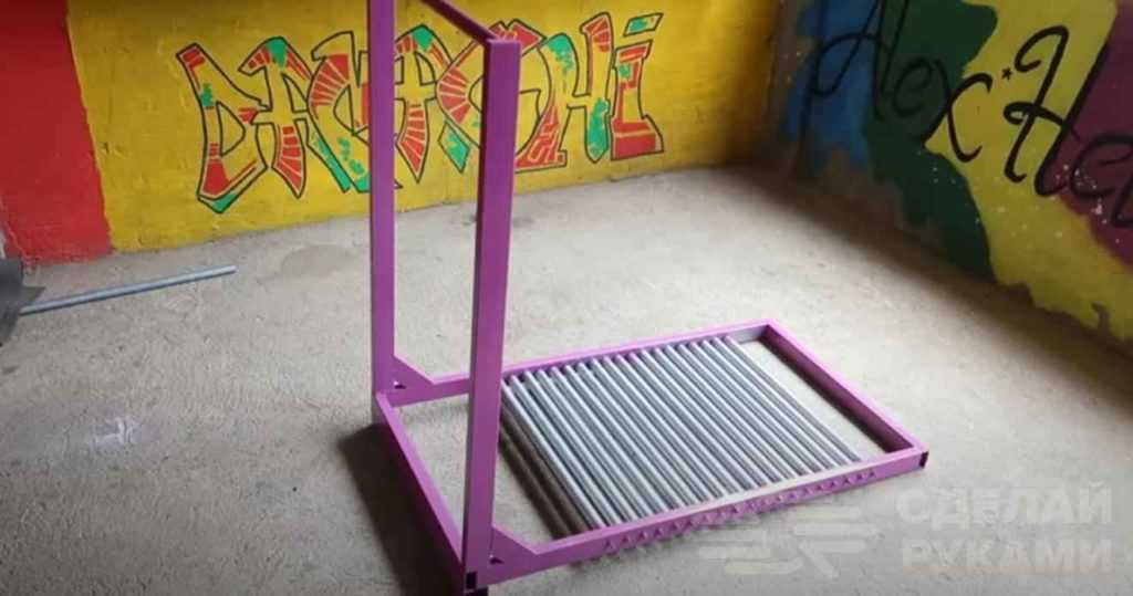 На последнем этапе останется только закрепить трубы — устанавливаем их между двумя боковыми стенками опорной площадки. Каркас тренажера необходимо будет покрасить.