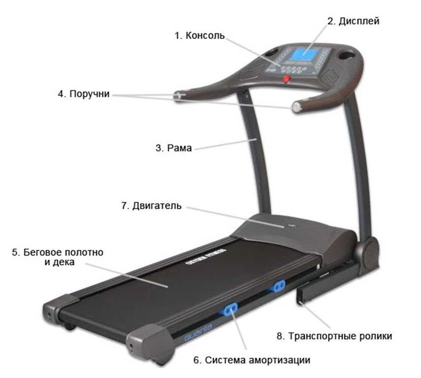 Любая беговая дорожка состоит из нескольких деталей. Они позволяют сохранять устойчивость конструкции во время тренировок, удержать равновесие пользователю и поддерживать необходимую динамичность полотна.