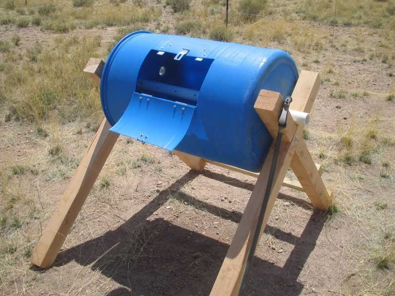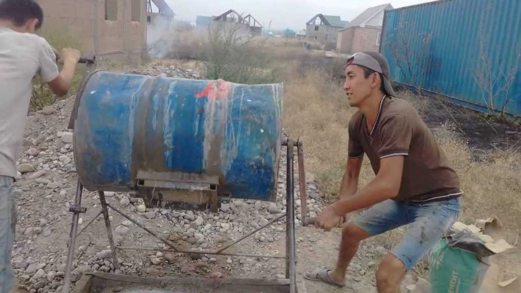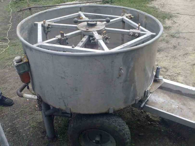 В качестве емкости можно использовать бидон из-под молока или старую ненужную металлическую бочку. Такую бочку или металлический бидон следует установить на выполненном при помощи сварки металлокаркасе. Ось вращения закрепляется внутри или снаружи ёмкости, а привод выполняется при помощи небольших шестерёнок и прочной ручки. Внутри емкости можно приварить или закрепить небольшие лопасти, что улучшит размешивание раствора. Останется лишь выполнить небольшие металлические ножки, которые привариваются к несущему каркасу.