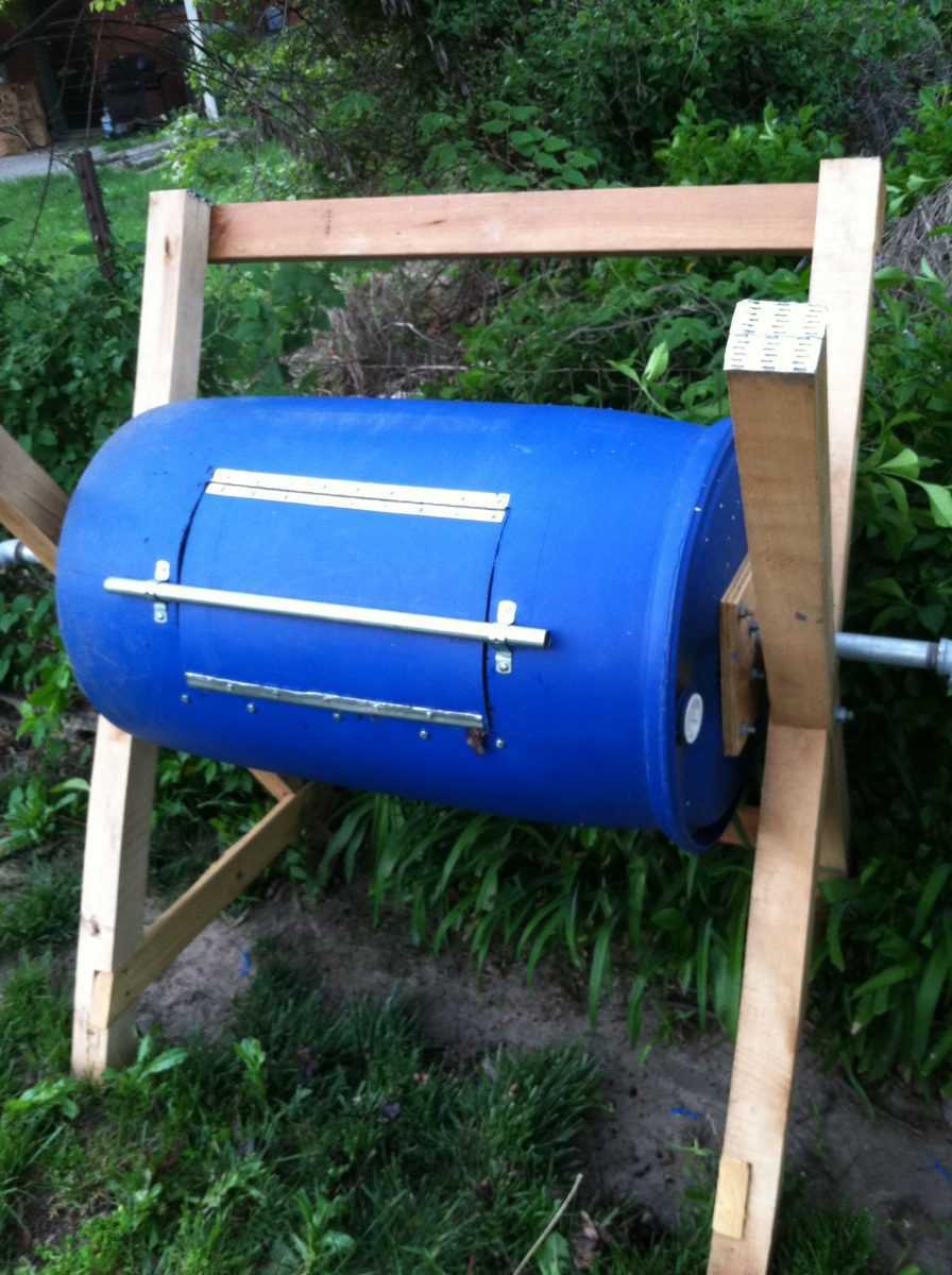 - Дрелью прорезать отверстия по диагонали для стержня, который будет держать бочку, и крутить ее. Также следует сделать загрузочное отверстие.