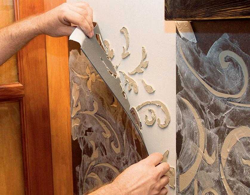 В продаже можно найти также трафареты для создания отпечатков в декоративной штукатурке. С их помощью выполняются большие и сложные узоры. Но у подобных вариантов имеется один недостаток, который заключается в необходимости тщательно очищать выемки от штукатурной смеси. На эту процедуру может уйти много времени, а декоративная штукатурка быстро сохнет, и выполнить узор будет невозможно.