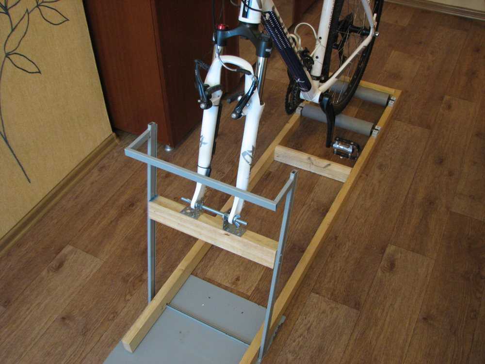 Если вы правильно проделали все вышеперечисленные действия, то велосипедное колесо должно идеально помещаться между рейками. Так байк будет находиться в устойчивом положении, даже если шина не будет касаться пола.