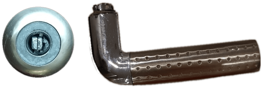 Дверная фурнитура на розетке работает по такому же принципу, как и на планке. Отличаются они лишь формой в месте соединения рукоятки и замочного устройства – основание изделия выполняется в форме круга или квадрата. Выпускается много моделей с современным дизайном. Материалом изготовления обычно служит сплав металлов: алюминия, меди, латуни или стали.