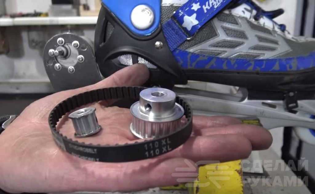 Потом необходимо будет установить на валы двигателя и заднего колесика большой и маленький алюминиевые шкивы, и натянуть ремень.