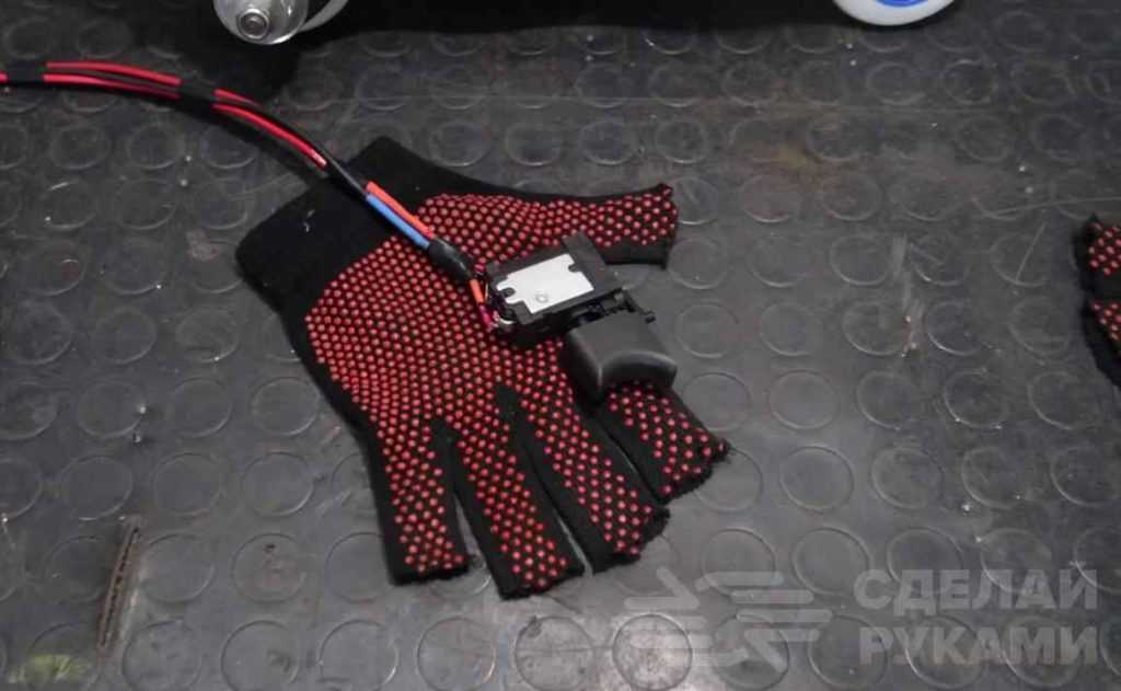 После этого останется только подключить электромотор к аккумулятору, а также сделать кнопку. Ее мастер приклеил на термоклей к перчатке. Сам АКБ помещается в сумочку, которая закреплена на поясе.
