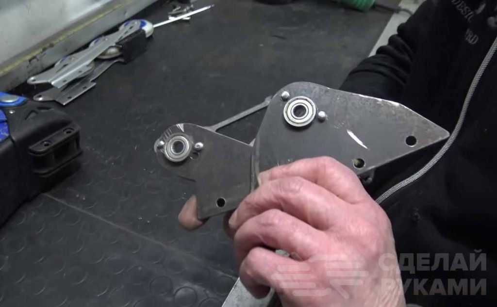 Затем мастер вырезает еще один кусок пластины, чуть поменьше. В заготовках надо будет сделать отверстия: отдельно под крепление и отдельно под «посадочные места» под подшипники. А потом мастер устанавливает подшипники.