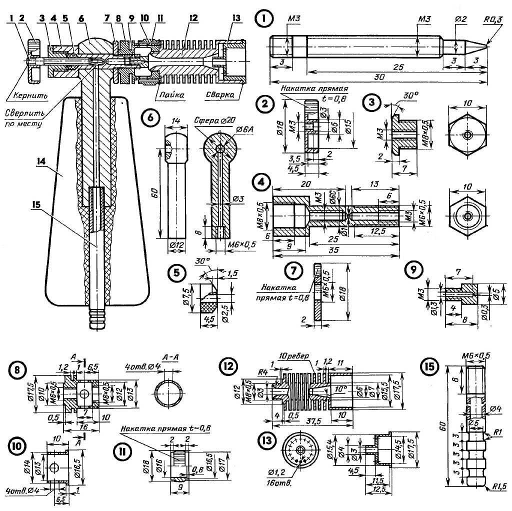 И под конец дадим чертежи нескольких горелок для газовых горнов. Для художественной ковки они вполне подойдут, а, что ни говори, из кузнечных работ она самая востребованная. Все эти горелки – инжекционные прямоточные. Куда более эффективные и универсальные вихревые слишком сложны для самостоятельного изготовления.