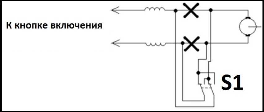 Две половины обмотки возбуждения электродвигателя расположены на статоре. По одному проводу от них идут к щеткам. Разрезаем эти провода. Следует отметить, что при работе щетки вибрируют, поэтому для их подключения использованы провода с повышенной гибкостью. Если разрезать провода близко к щеткам, то гибкая часть будет короткой, и от вибрации он может переломиться. Чтобы этого не произошло, разрезаем провода поближе к обмоткам возбуждения. К ним припаиваем провода, идущие к подвижным контактам переключателя S1.
