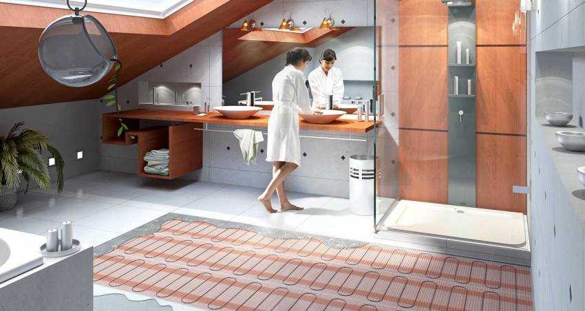 Для смягчения деформации при температурных расширениях несущих конструкций и основной стяжки по периметру комнаты прокладывают деформационную ленту. При проведении работ влажность ванной комнаты не должна превышать отметки в 50%. Если же это значение несколько превышено, стоит позаботиться об обустройстве гидроизоляции.