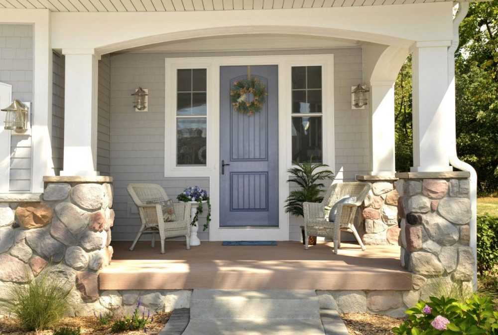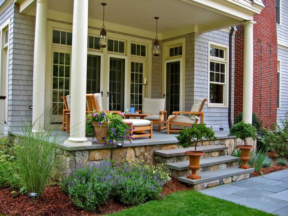 Выбор декора зависит от стиля, в котором выполнен дом и участок. Всегда уместны будут растения: цветы в горшках или высоких вазах, в кашпо на перилах или у входа. На крыльце-террасе можно поставить мебель: плетеные или кожаные кресла (кресло- качалку), шезлонг, небольшой столик, декоративную посуду или подсвечники, салфетки, пледы.