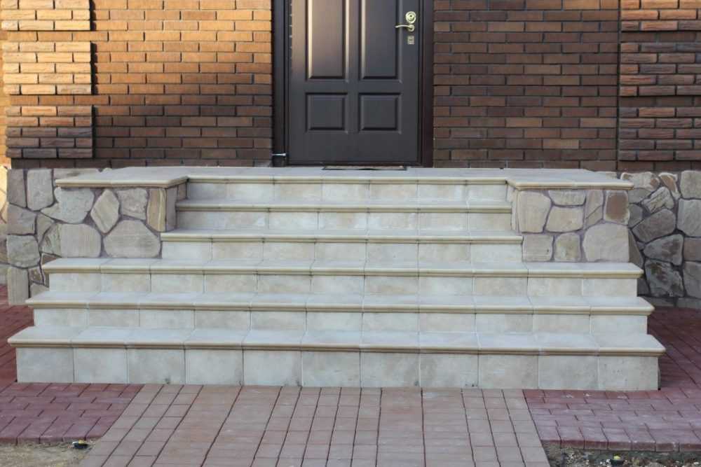 Крыльцо, построенное из бутового камня, а сверху облицованное клинкерной плиткой под мрамор