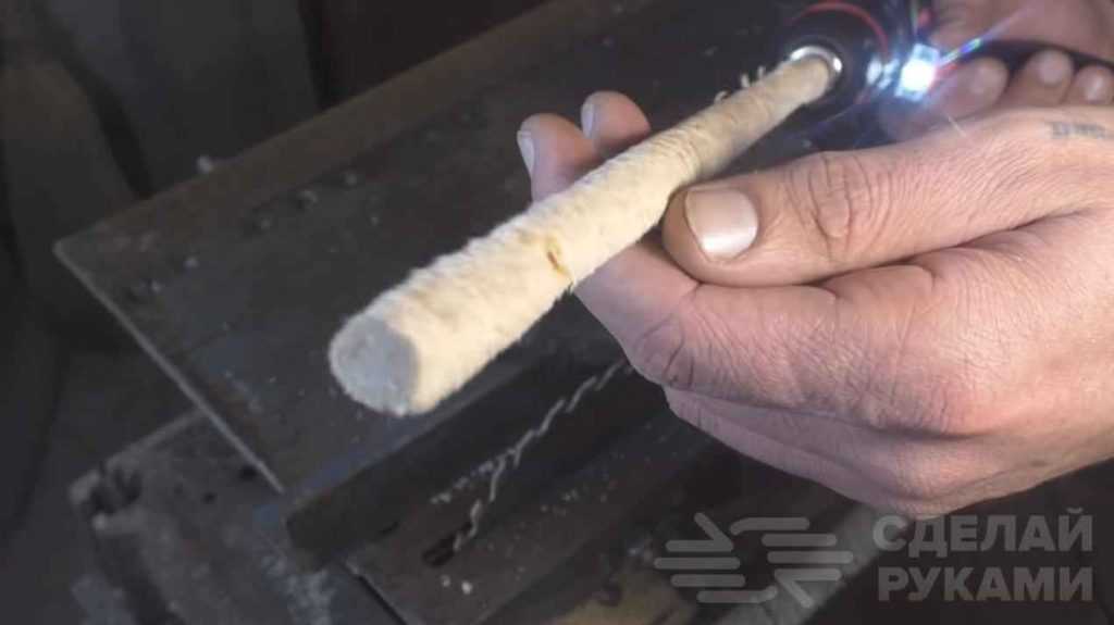 Как было сказано выше – нужно вращать заготовку, то есть палочку. Для того, чтобы ее заставить вращаться можно вставить её в дрель или шуреповерт. А если размер заготовки такой, что она не может быть зажата в патроне, то можно или сточить ее конец или вставить в торец шуруп-шпильку. Так мы и поступим: