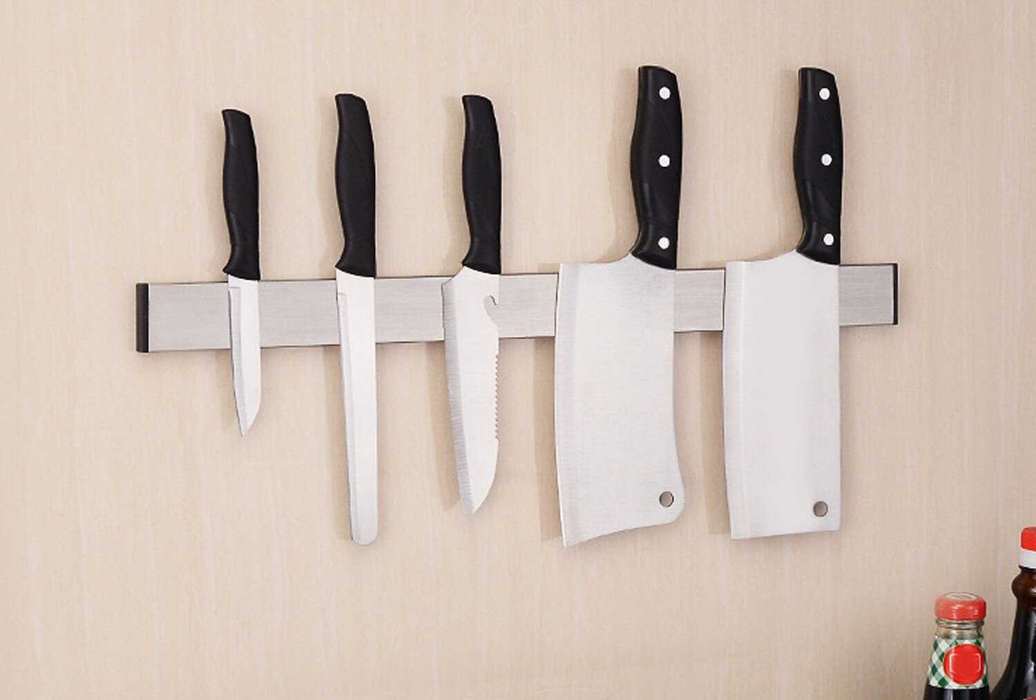 Оригинальность держателя — великолепна. Производя монтаж магнитной планки, следуйте инструкции, не располагайте её на движущихся поверхностях. К делу следует отнестись серьёзно – нож на кухне самый опасный предмет.