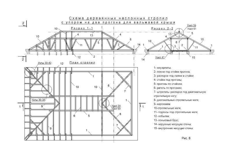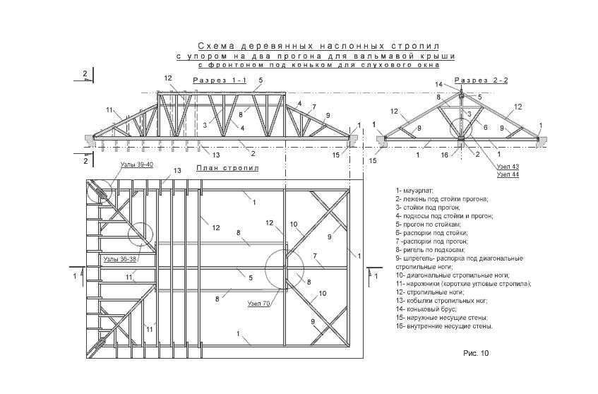 Схема деревянных наслонных стропил с упором на два прогона, для вальмовой крыши с проходным чердаком, показана на рис.8. Если при наличии двух прогонов у стропильных ног ставят подкосы, то для восприятия создаваемого ими распора между лежнями располагают распорки (рис.8 разрез 2-2 поз.3).