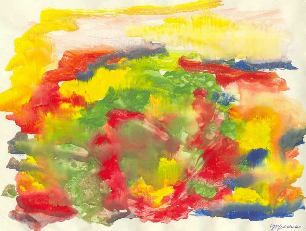 - Кляксография: это одна из самых простых в исполнении техник создания изображения в монотипии. С ней справится любой: на центр листа бумаги наливается акварель или гуашь, а затем бумага наклоняется в разные стороны, чтобы краска растеклась по поверхности, образуя цветные потеки: [].