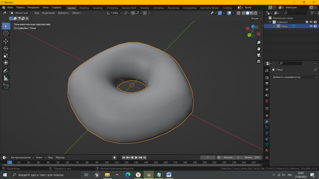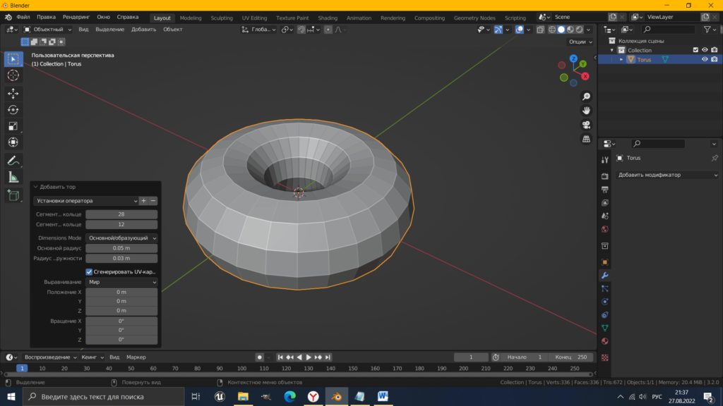 Приступим к моделированию. Первым делом удалим со сцены куб. Далее клавишами Shift+A вызываем подменю «добавить» – «меш» – «тор». На сцене появиться новый объект «тор». В левом нижнем углу будут висеть настройки тора. Щелкаем на них и проверяем его размеры.