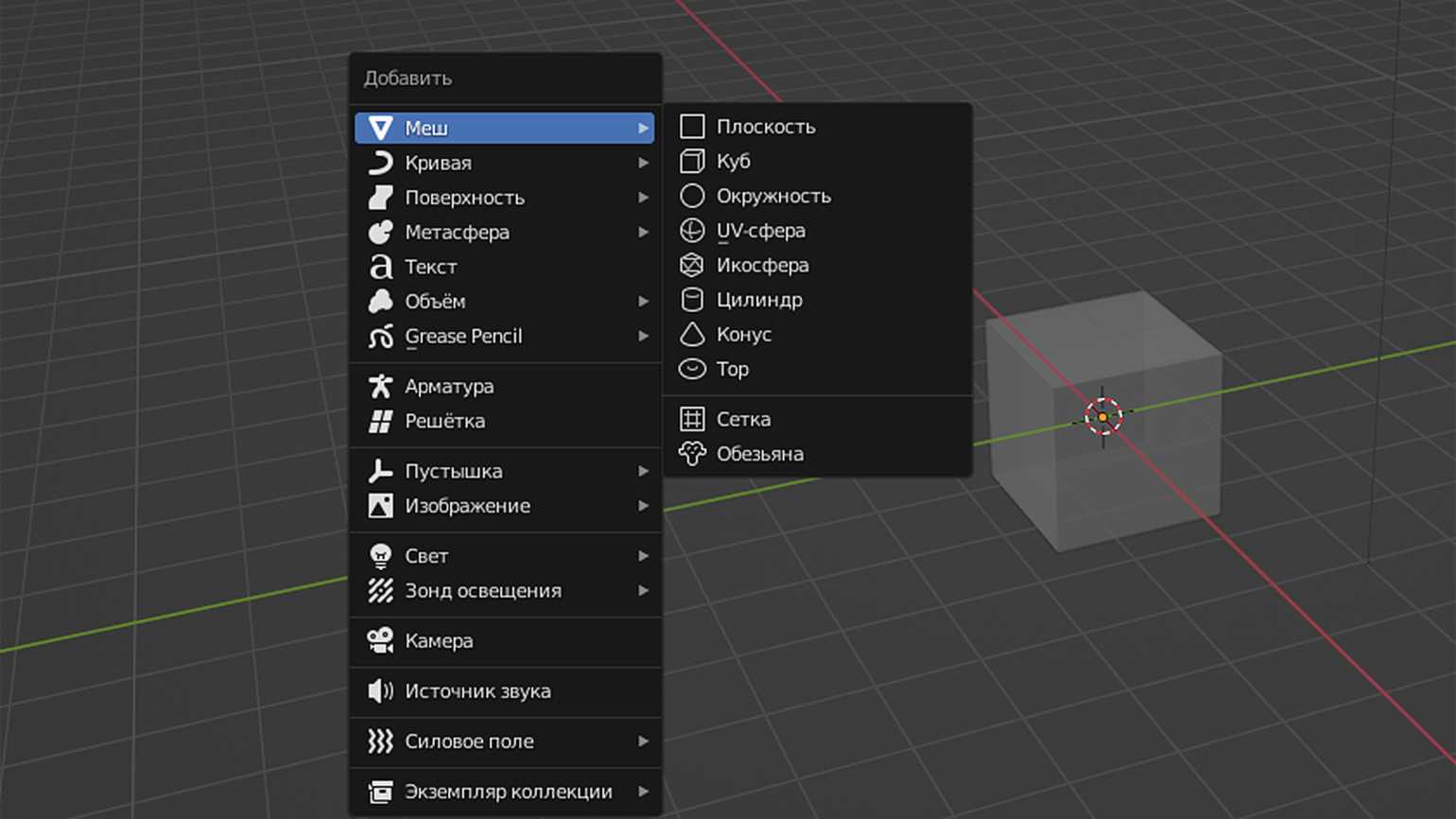 Как мы уже знаем, в сцене по умолчанию нас встречает куб — один из базовых объектов-примитивов, доступных в Blender. Рассмотрим другие фигуры, которые может сгенерировать программа. Сочетание Shift + A вызовет меню со множеством объектов, распределённых по категориям, у каждой из которых свой функционал. В этом уроке нас интересует вкладка Меш (Mesh) с геометрическими примитивами.