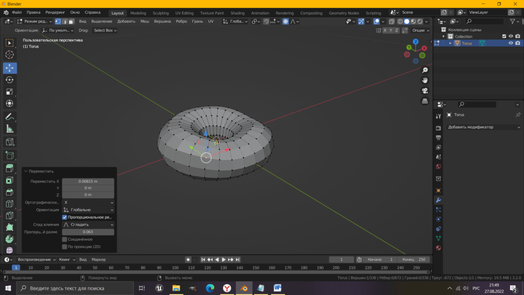 Для более реалистичного образа нам необходимо слегка помять и деформировать данный меш. Для этого переключаемся в режим редактирования, нажимаем клавишу Tab. Кнопкой мыши выбираем точку на объекте и в верхней панели инструментов находим «пропорциональное редактирование», включаем. Заживаем левую кнопку мыши, крутим колесико для уменьшения масштаба действия. После нажимаем «G» и перемещаем точку, деформируя тор. Поступаем так еще с несколькими точками и придаем понравившуюся нам форму.