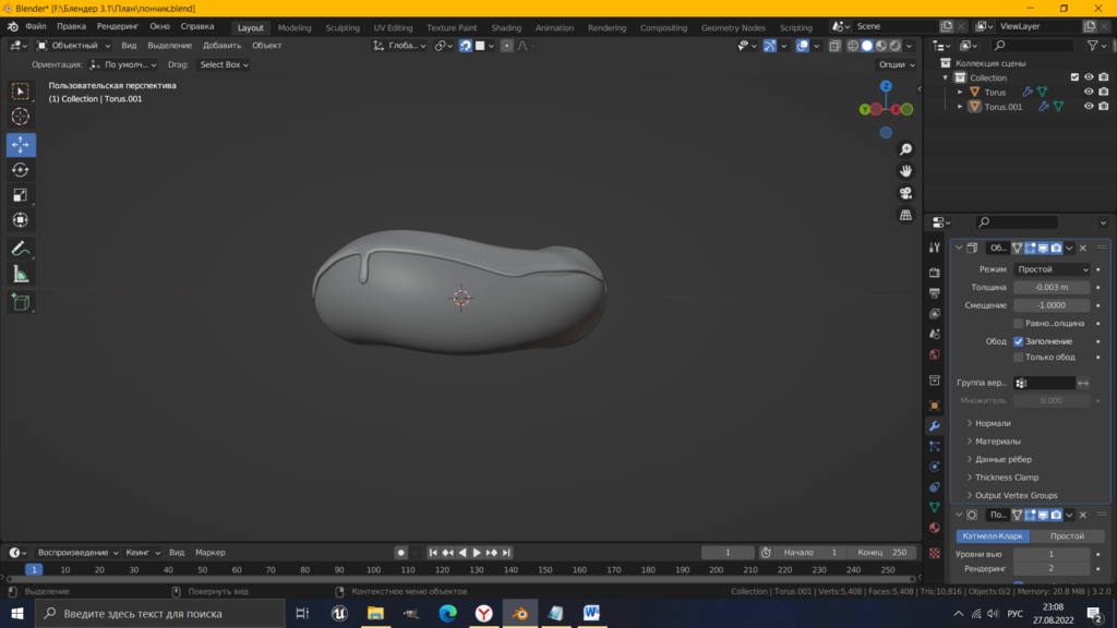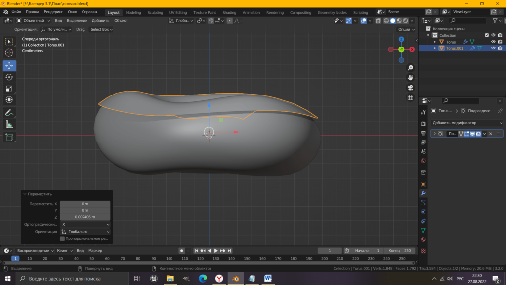 Для копирования части пончика жмем сочетание клавиш Shift + D, затем Р – «выделение» это позволит отделить в новый объект часть меша. Придадим объемности глазури.