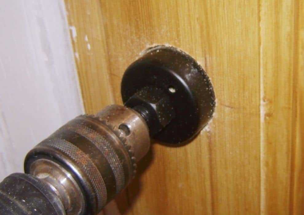 При помощи накладки в виде коронки на 50 мм дрелью выпиливается отверстие насквозь на месте первой отметки. Постарайтесь, чтобы края спила были ровными, без повреждений и потери привлекательности двери.