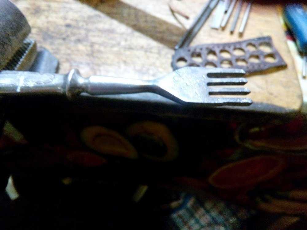 Изогнутые зубцы вилки необходимо предварительно выровнять. Для этого нужно нагреть рабочую часть вилки над огнем, предварительно зажав ее рукоятку в тисках и простучать зубцы молотком. После этого часть зубцов следует аккуратно надпилить с помощью пилы ножовки и отломать пассатижами.