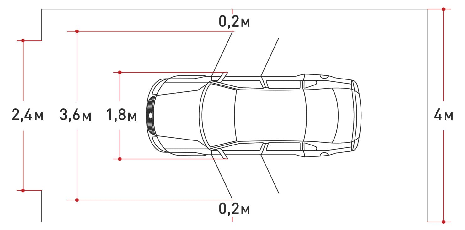 При расчёте ширины следует учитывать общий габарит вместе с зеркалами бокового вида, а при расчёте высоты — открытую дверь багажника