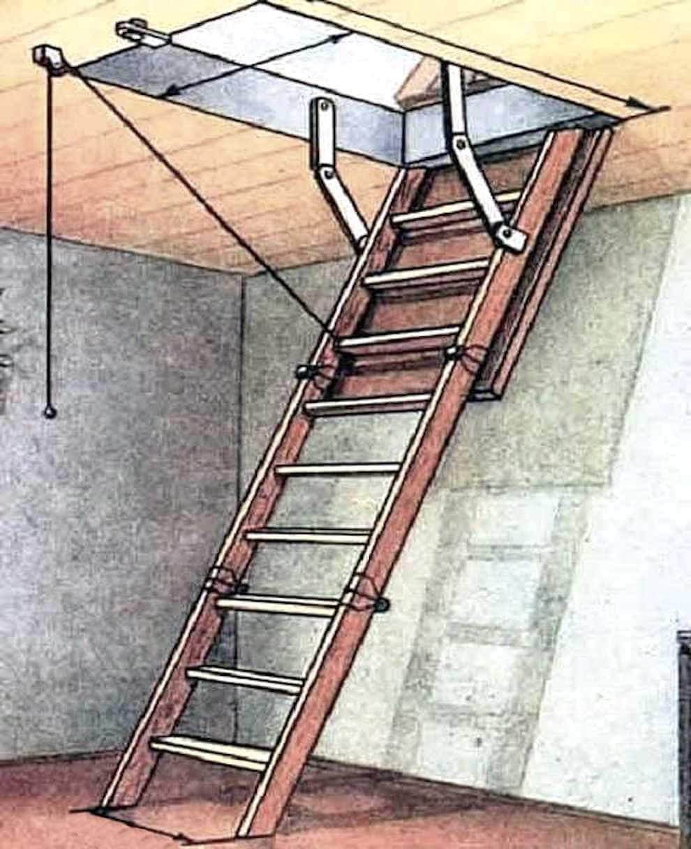 Другой вариант – это смонтировать самодельную лестницу с откидной частью. Крепиться она может на потолочной двери или люке, затем легко откидываться и раскладываться. Секций может быть 2–3, в разложенном состоянии она получается жесткая и стационарная. Для монтажа ее каркаса и ступеней используют твердые породы древесины, а для крепления и механизма раскладывания – металлические детали. При грамотном проекте и аккуратной работе такая конструкция может быть автоматическая, очень удобная и совершенно безопасная.