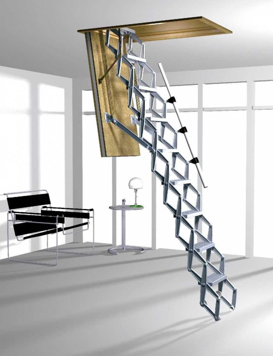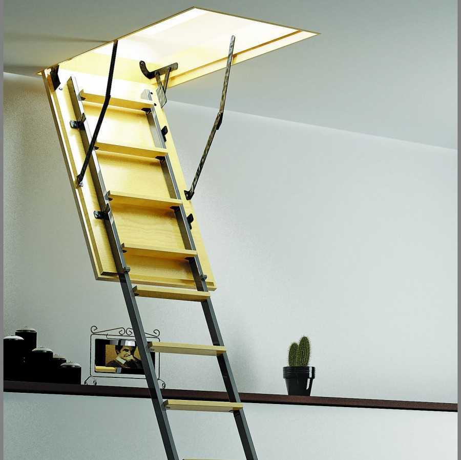 Чердачные лестницы складного и раздвижного типа экономят свободное пространство на нижнем этаже, гарантируют безопасный подъем, а также при необходимости, могут быть препятствием для проникновения детей на чердак без разрешения взрослых. Наиболее прочным материалом в качестве каркаса лестницы может быть дерево, металл, а также комбинация из дерева и металла. Такие конструкции бывают на пружинах и раскладными, с поручнями и без. Лестница складная должна быть устойчивой и безопасной, ведь расстояние от нижнего этажа до чердака зачастую составляет минимум 2 метра, а это приличная высота, с которой можно упасть и получить травму.