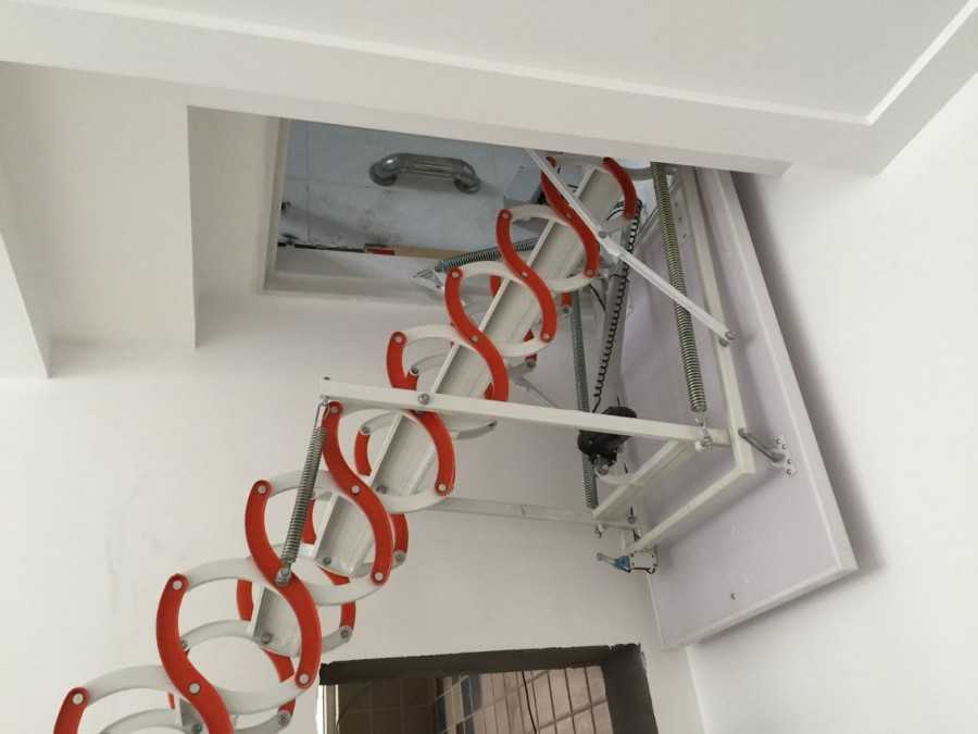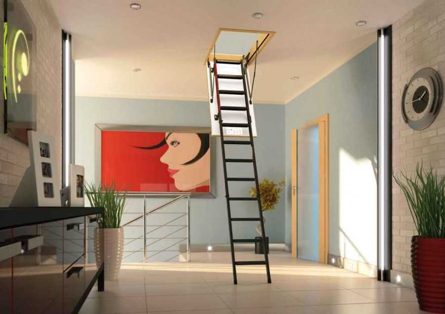 В данном случае речь идет о лестнице чердачной, складного типа, которая, ввиду своей конструкции, занимает не много места и является наиболее подходящим вариантом в качестве средства перемещения с первого этажа на второй.