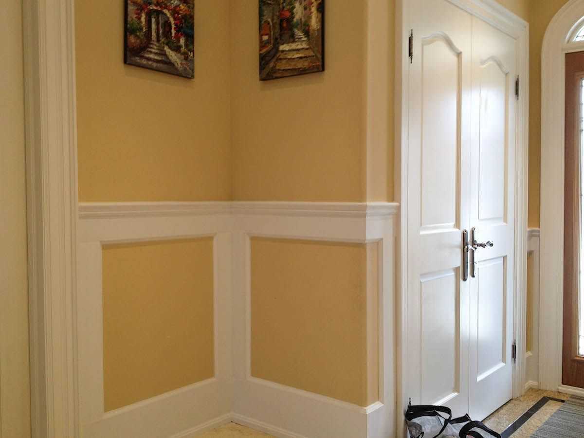 Каркасная конструкция. Представляет собой каркас прямоугольной панели из брусков без филёнки (то есть только рамка). Такую секцию крепят к предварительно покрашенной или оклеенной обоями стене, как на фото ниже.