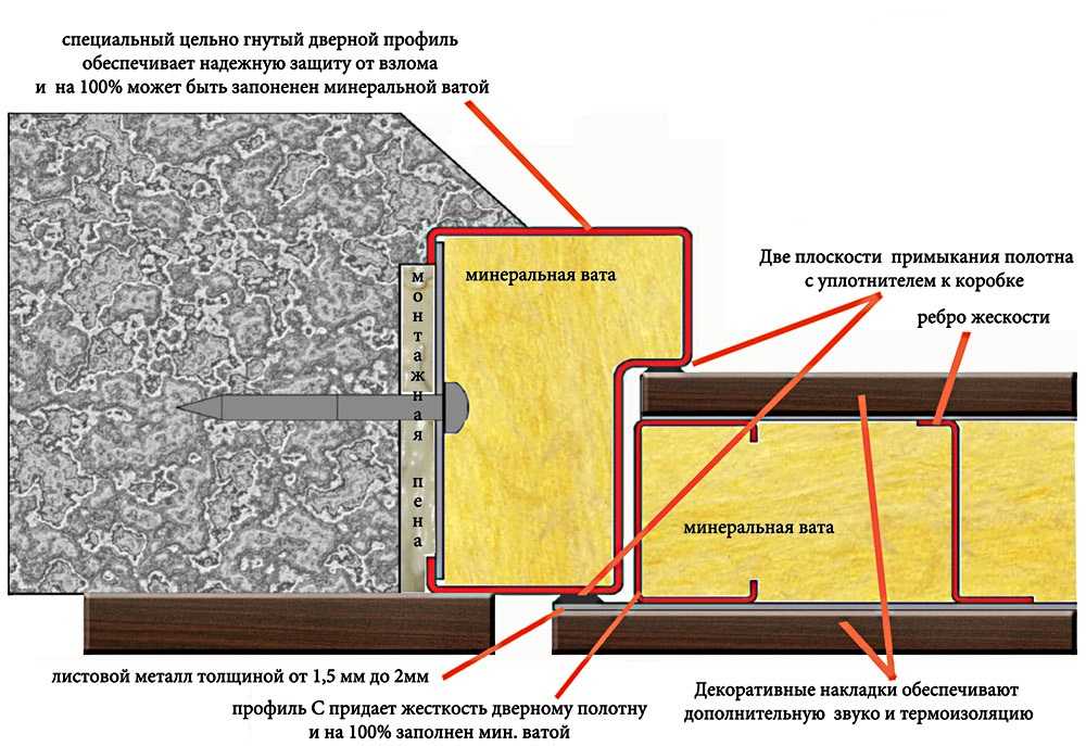 при теплоизоляции металлических дверей, нужно заполнить полость в полотне хорошим утеплительным материалом. Первым делом нужно вскрыть полотно, и вынуть картон, часто применяемый в китайских конструкциях. Вторым этапом будет заполнение пустоты мин ватой или пенопластом.