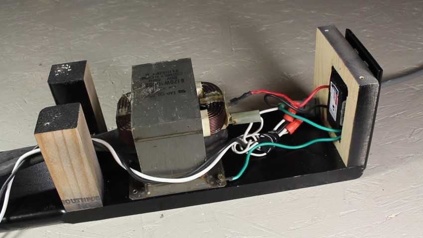 Корпус самодельного аппарата делают из фанеры, а движущиеся детали (рычаги) — из деревянных брусков. После сборки трансформатор крепится к основанию саморезами и присоединяется к заземлению. На торцах рычагов устанавливаются контактные электроды, и к ним подключаются провода вторичной обмотки. Верхний рычаг подпружинивают, чтобы он в исходном состоянии был приподнят.