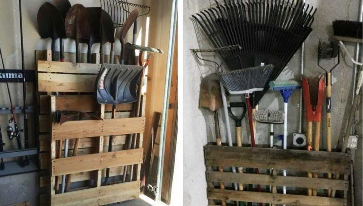 Грабли, лопаты и вилы можно хранить на стене гаража или сарая, если прикрепить к ней специальные держатели-крюки.