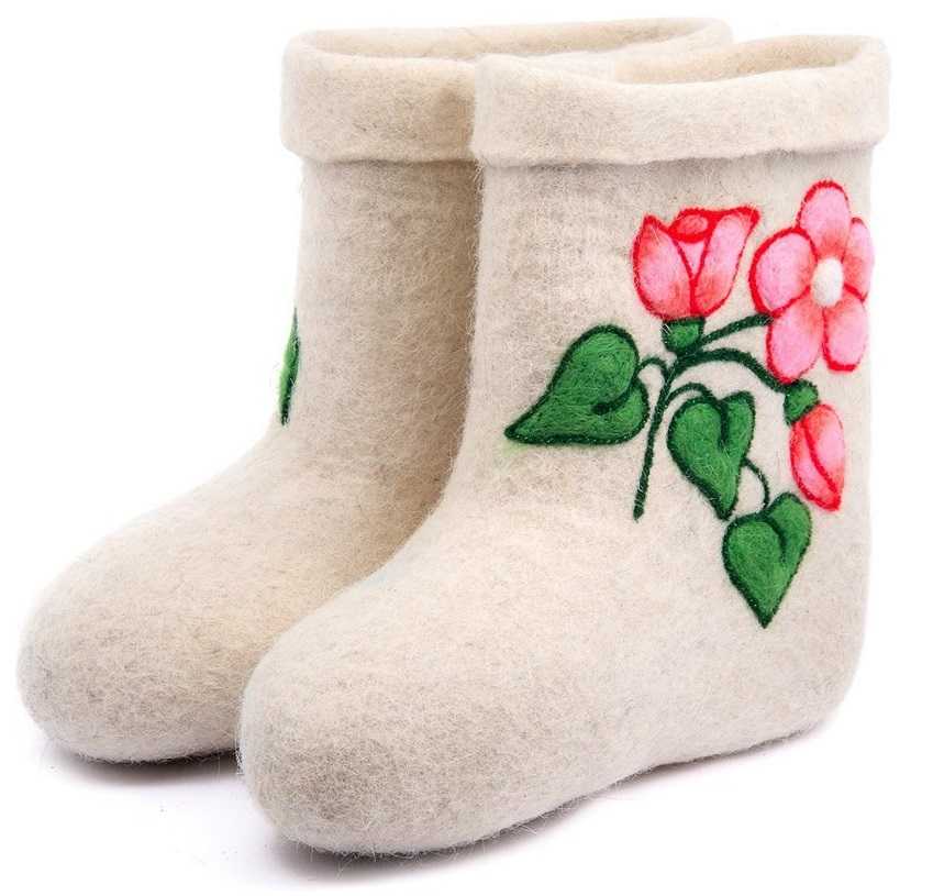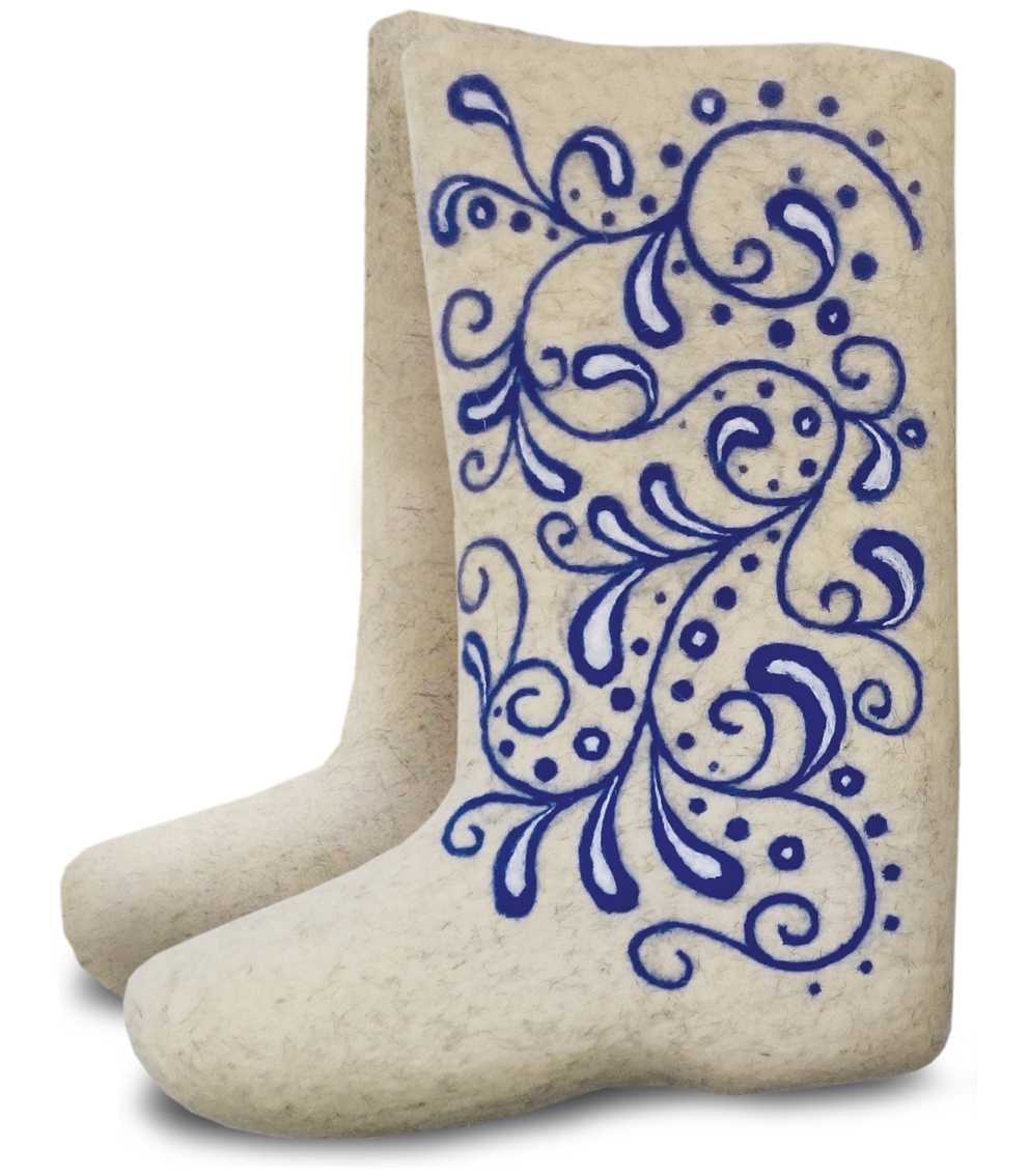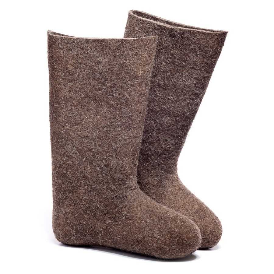 Сапоги изготавливаются из овечьей шерсти, которой свойственно сильно уплотняться, с помощью чего и создается необходимый эффект. Обувь сохраняет внутреннее тепло, но при этом хорошо пропускает воздух, что не дает ногам вспотеть и запреть. Шерстяной материал устойчив к влаге, хотя нужно понимать, что по лужам в валенках не походишь — они больше подходят для прогулок по сухому снегу.