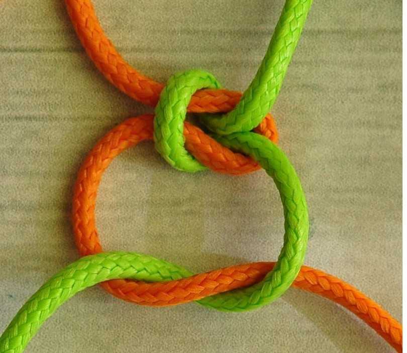 - Натягивая короткую нить рукой, другой выполнить узел, обвивая её снизу вверх и пропуская вперёд.