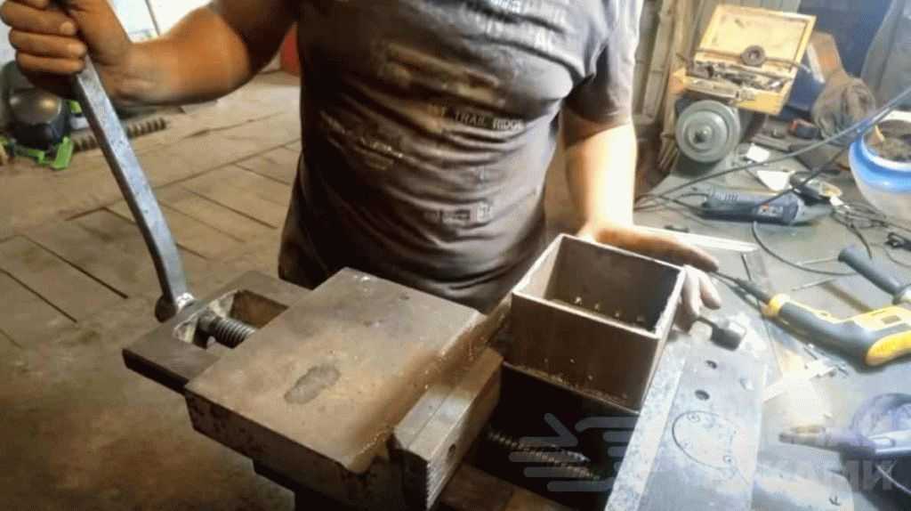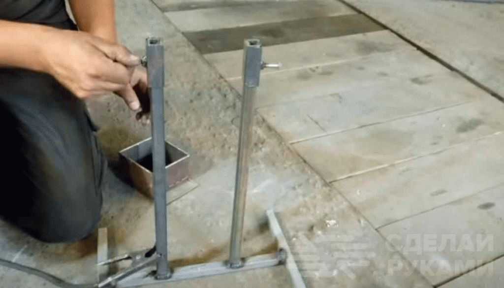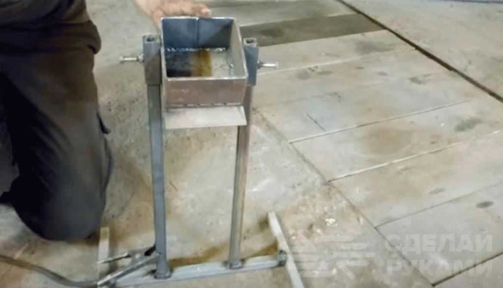 Далее из кусков квадратного профиля автор сваривает стойку, на которой будет располагаться ванночка.