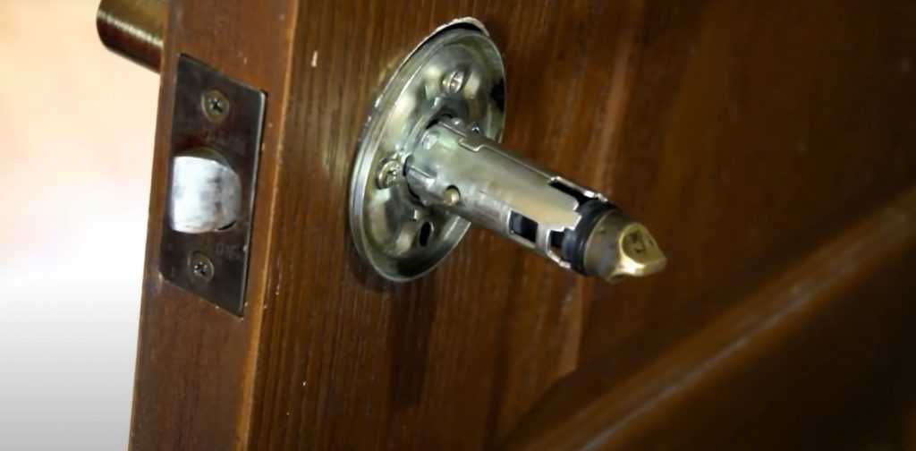 - Рукоятка демонтируется, после чего из отверстия механизма извлекается прямоугольный штифт, передающий усилие от нажима на пружину ригеля.