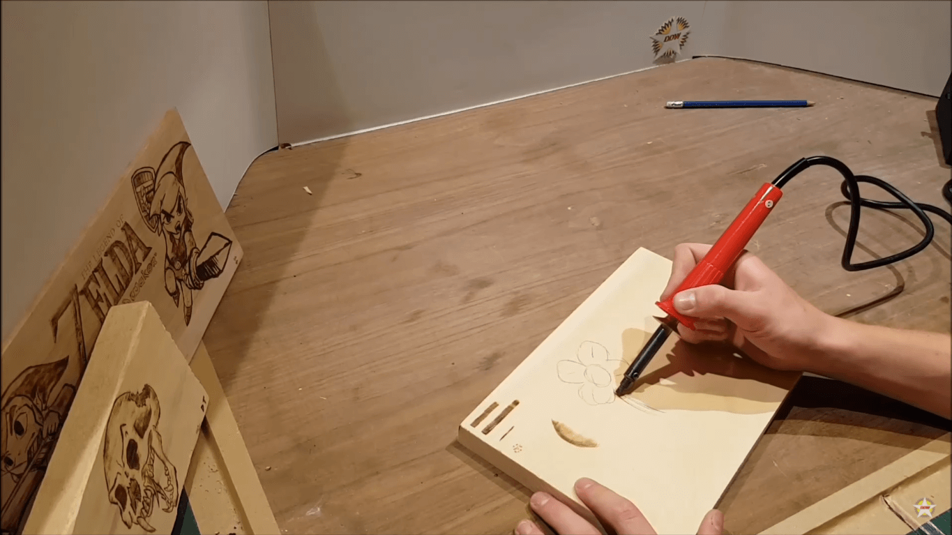 Непосредственно к процессу выжигания можно приступать после того, как паяльный элемент нагреется до нужной температуры. В современных моделях пирографов о готовности прибора к работе сигнализирует встроенный светодиодный индикатор. Если латунная насадка или нихромовая проволока не прогреваются должным образом, это указывает на неисправность трансформатора. Таким инструментом детям лучше не работать. Не забывайте периодически отключать пирограф от электросети.