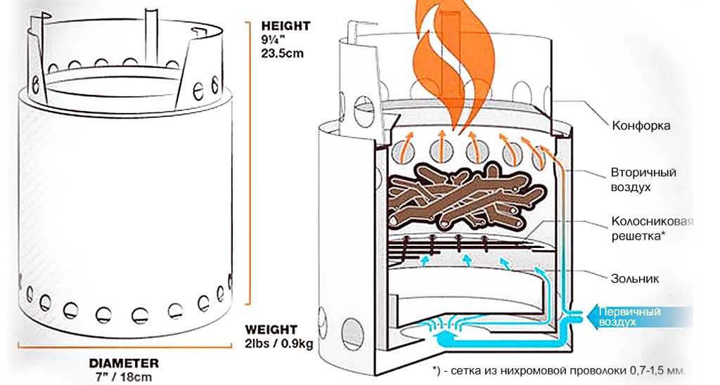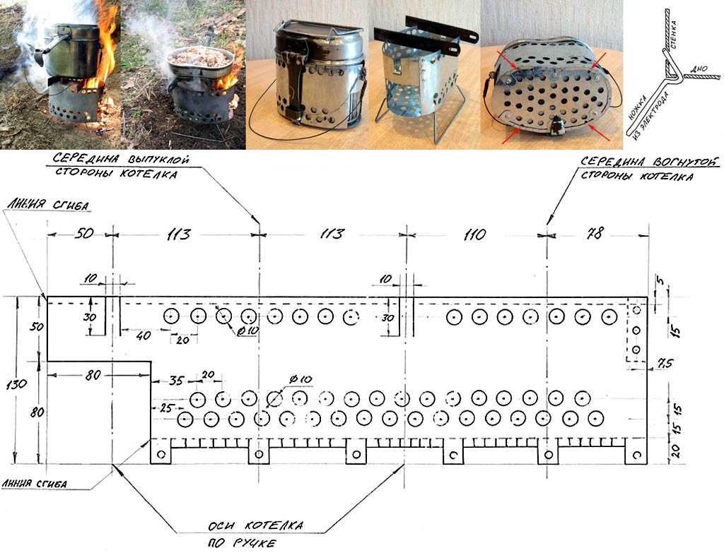 Устройство и чертеж с размерами походной печи-щепочницы для армейского котелка