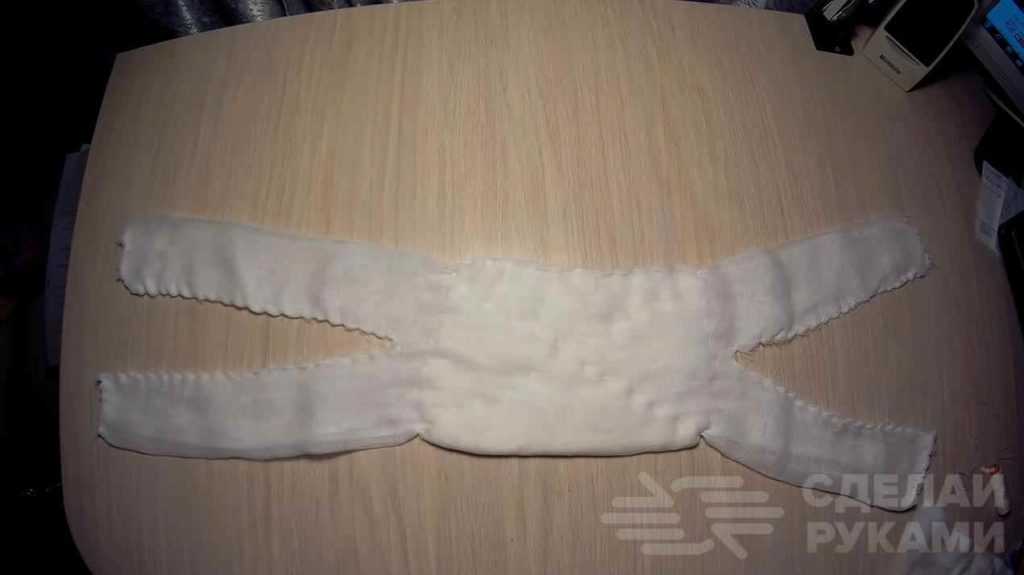 Марлю разложите на твёрдой поверхности и следует проутюжить. В центральной части лоскута выкладывается слой ваты. По нижнему срезу ваты марлю надо сложить пополам. Чтобы было удобнее работать дальше, всю конструкцию нужно снова прогладить утюгом.