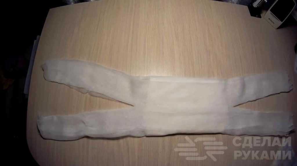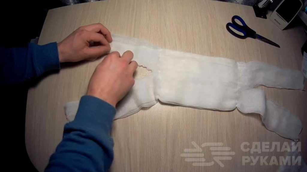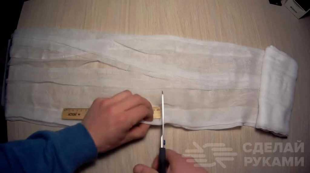 Чтобы сформировать завязки (а они обязательно должны быть), края марлевого отреза необходимо аккуратно разрезать ножницами практически до самой ваты.