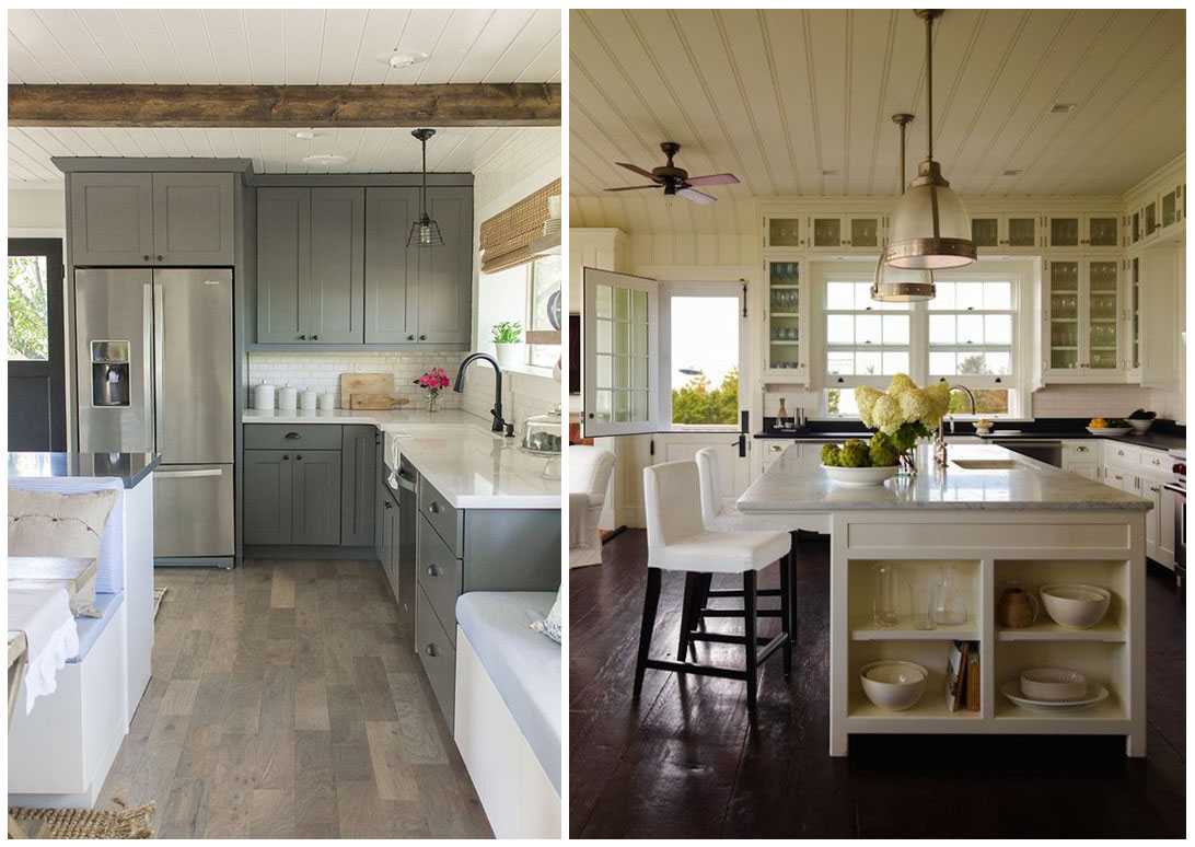 Если в кухне низкий потолок, то высокая мебель с вертикальными дверцами зрительно «поднимет» стены и расширит пространство. При однотонных сплошных шкафах стены кажутся выше. Усилить этот эффект можно с помощью светлого или белого фасада. Также можно белым цветом покрасить верхнюю часть гарнитура, таким образом навесные шкафы будут сливаться с потолком и не будут «резать» стены пополам. Кухонные фасады, сделанные из вертикальных реек, тоже «удлиняют» пространство. Чтобы такой эффект не свести к нулю, не рекомендуется реечные шкафчики дополнять стеклянными дверцами, это внесет в интерьер горизонтальные линии.