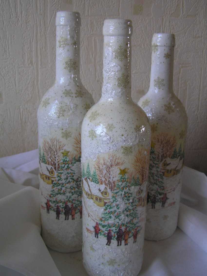 Нанесите на бутылку ровным слоем один тон и прикрепите выбранные рисунки, предварительно вырезанные из салфеток.