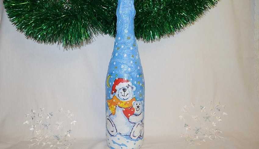 Сложно представить Новый год без бутылки шампанского. Чтобы сделать запоминающийся подарок друзьям или близким, можно декорировать ее при помощи красивых новогодних салфеток.