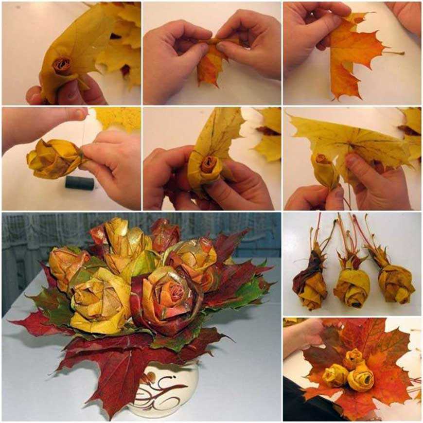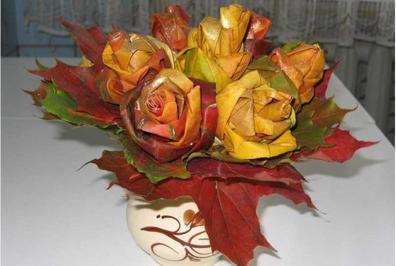 Можно сделать букет легких цветов из листьев. Красиво получаются розочки. Для этого следует собирать желтые, оранжевые или красные листья, которые еще не полностью засохли. Из них аккуратно скручиваются цветы.